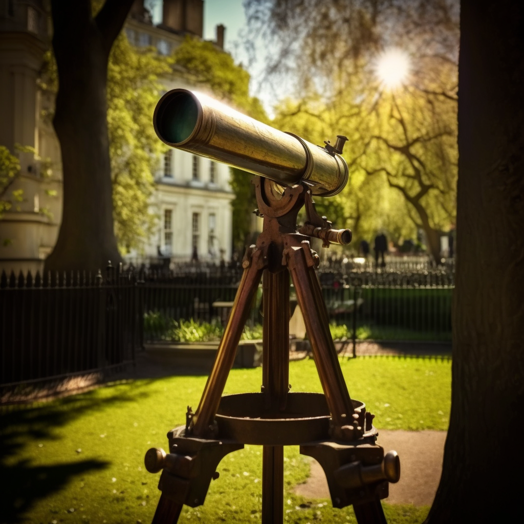 An eighteenth-century telescope; Fitzroy Square, London; Bright, Spring light; 35mm, photorealistic, Canon EOS 5D Mark IV DSLR, f/5.6 aperture, 1/125 second shutter speed, ISO 100; –v 5 –q 2 –s 90
