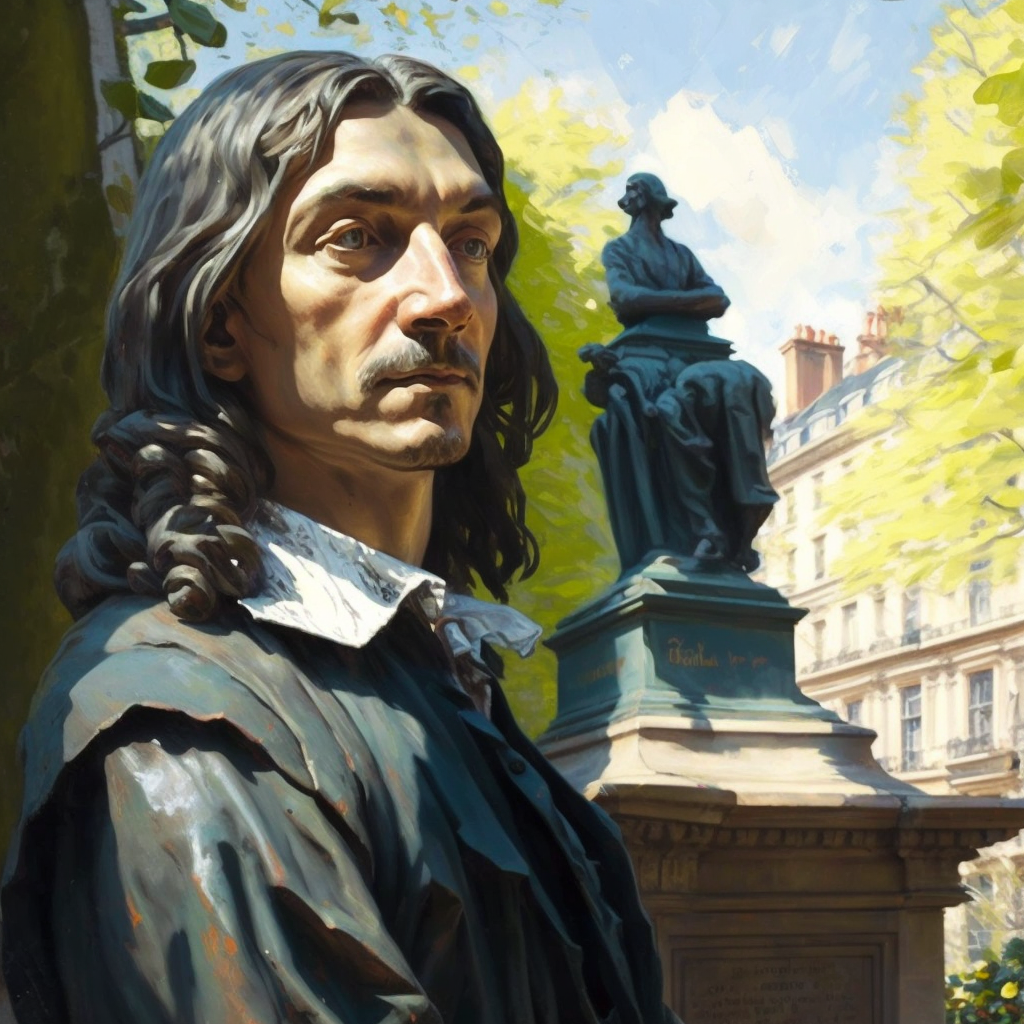René Descartes looking towards us; Fitzroy Square, London; Bright, Spring light; Realist painting; –v 5 –q 2 –s 200